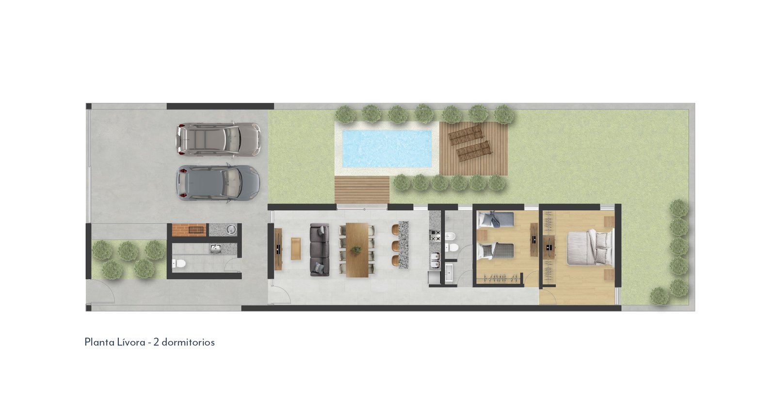 El modelo Lívora es un diseño contemporáneo, funcional y adaptado a las necesidades de una vivienda moderna. La propuesta parte de una planta sencilla, eficiente y flexible, pensada para optimizar el uso del espacio sin perder confort. La circulación está organizada de manera fluida, permitiendo una convivencia armónica entre los espacios sociales y privados.